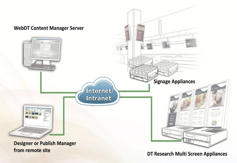 El software WebDT Content Manager es uno de los componentes principales del completo sistema de señalización WebDT. Su software de servidor web proporciona la gestión centralizada de dispositivos de señalización WebDT como reproductores multimedia y automatiza el diseño y la distribución de una amplia variedad de formatos de archivos multimedia en listas de reproducción. Estas listas se programan y se almacenan en una base de datos central para su distribución a la red de pantallas de señalización digital. Con WebDT Content Manager, el mensaje que se va a reproducir se ensambla, programa y distribuye para su reproducción dinámica a través de una red de dispositivos de señalización digital utilizando formatos de archivo y protocolos estándar.